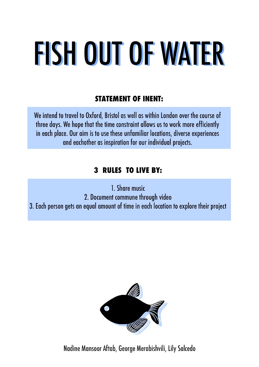 We also finished the poster (below) which has our manifesto and rules. We feel the name "Fish Out of Water" describes our group well as we don't know each other, and are going to place we have never been to.